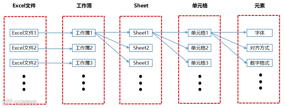 下图是Excel的中各个部分的组成关系,我们工作中每天会处理很多Excel文件,一个Excel文件其实就是一个工作簿。你在每次新建一个Excel文件时,文件名都会默认是工作簿x,其中x就是你新建的文件个数。而一个工作簿里面又可以有多个Sheet,不同Sheet之间是一个独立的表。每一个Sheet里面又由若干个单元格组成。每一个单元格又有若干的元素或属性,我们一般针对Excel文件进行设置最多的其实就是针对单元格的元素进行设置。