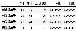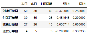 我们先用Pandas对数据进行计算处理,得到各指标的同环比情况,具体实现代码如下: