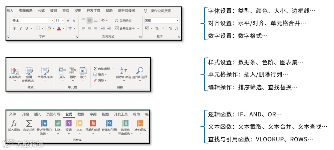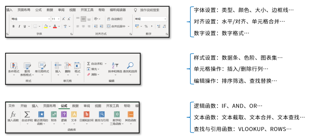 而针对单元格元素进行设置的主要内容其实就是如下图菜单栏中显示,比如字体、对齐方式、条件格式等内容。本书也是按照Excel菜单栏中的各个模块进行编写。