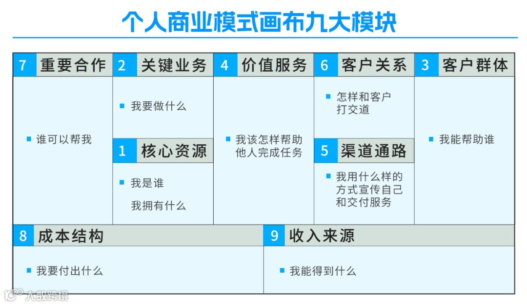 你需要了解自己的核心资源,梳理清楚自己的关键业务,明确自己的客户群体,贡献自己的价值服务,然后持续地宣传自己并交付服务,建立并维护好自己的客户关系,吸引越来越强大的重要合作伙伴,高效达成目标。