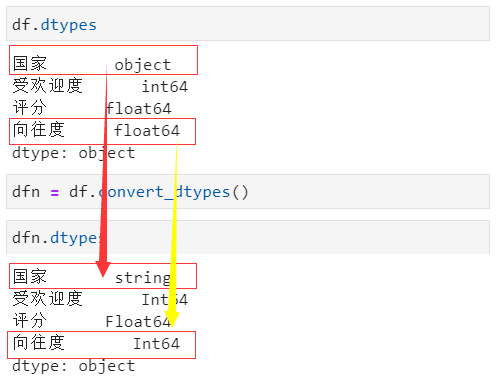 可以看到国家字段是object类型,受欢迎度是int整数类型,评分与向往度都是float浮点数类型。而实际上,对于向往度我们可能需要的是int整数类型,国家字段是string字符串类型。