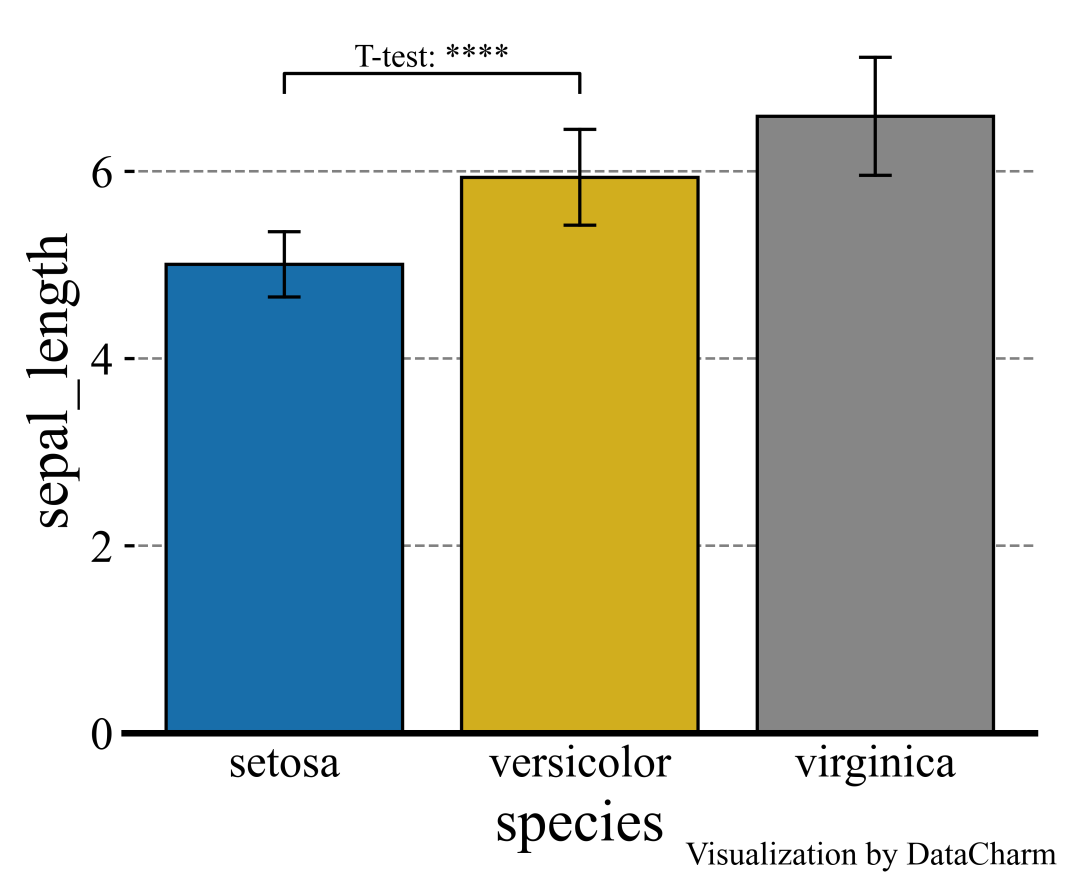 我们可以通过自定义绘图函数的方式在统计图表中添加显著性标注,这里我们直接使用Seaborn自带的iris数据集进行绘制,具体内容如下: