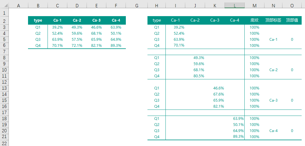 利用堆积柱形图的先做出背景部分,然后再利用堆积柱形图以次坐标轴的形式做出数据系列部分;难点在于如何做出底部的系列标准值,本例采用伪标签的方式,即添加一个空的数据系列通过数据标签的方式做出坐标轴标签的方式。