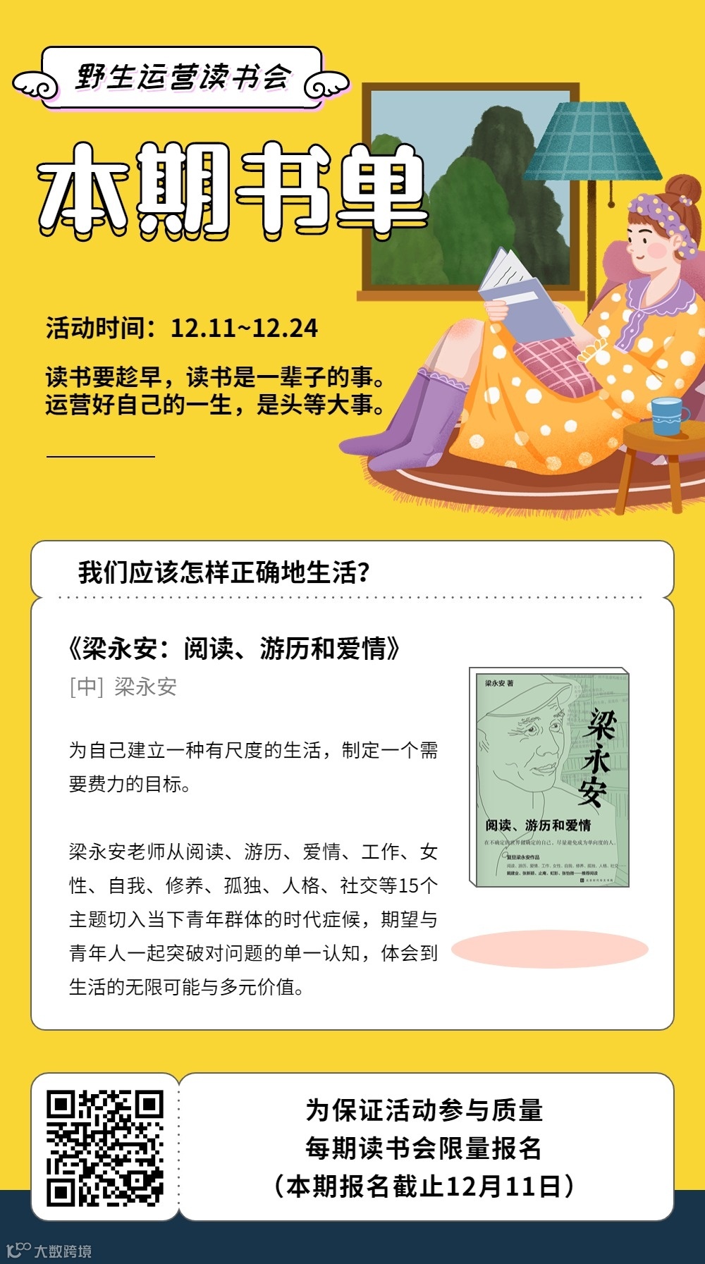 下期读书会,12月11日~12月24日,我们会开启新一轮共读《梁永安:阅读、游历和爱情》,对当代青年人非常有启发的一本书:)报名本期读书会,还会赠送往期55本书的领读笔记哦,感兴趣的扫码报名🙋