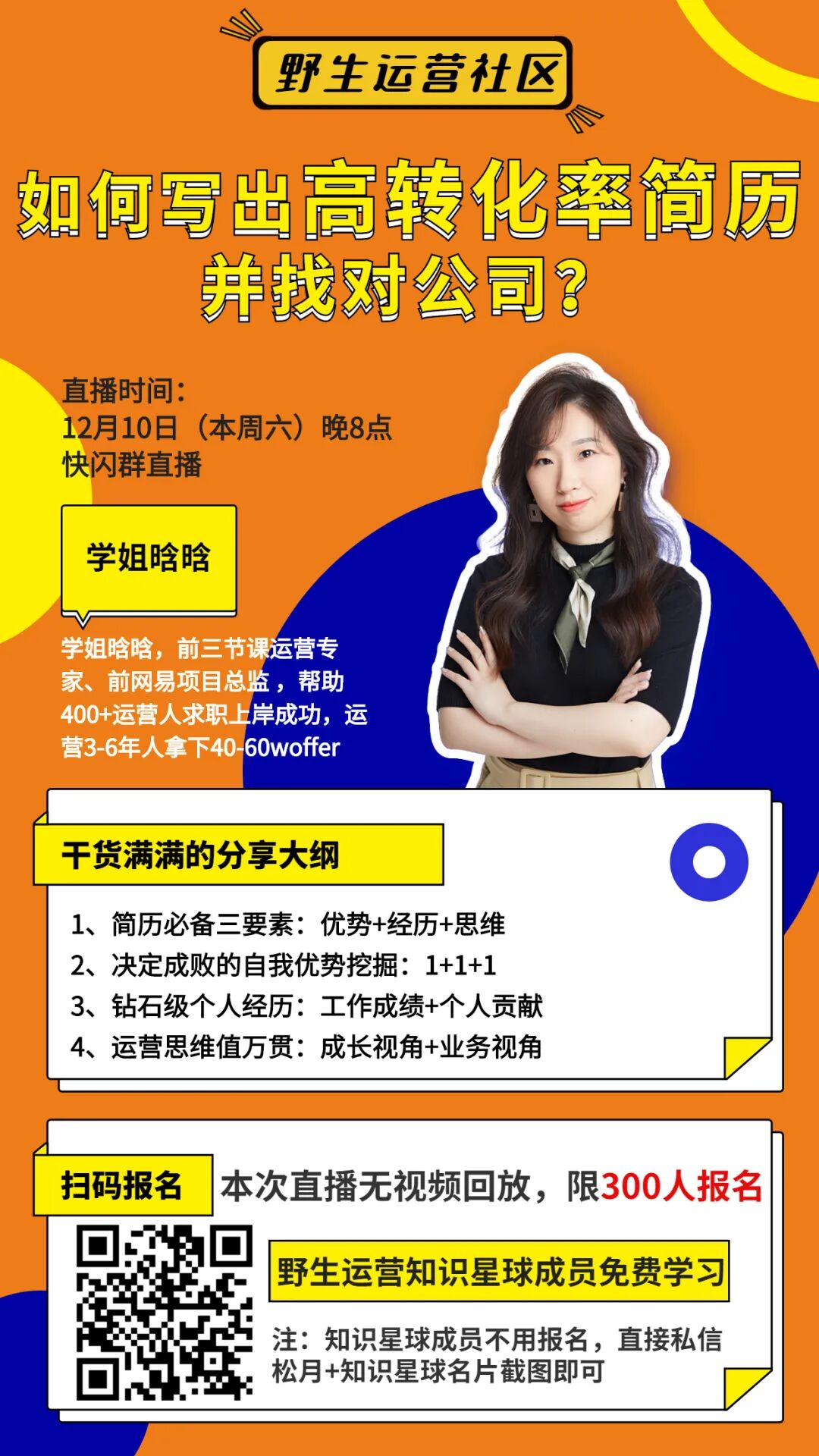 本周六晚8点,我邀请了来学姐晗晗,前三节课运营专家、前网易项目总监 ,帮助400+运营人求职上岸成功,运营3-6年人拿下40-60woffer,带来分享《如何写出高转化率简历并找对公司》。