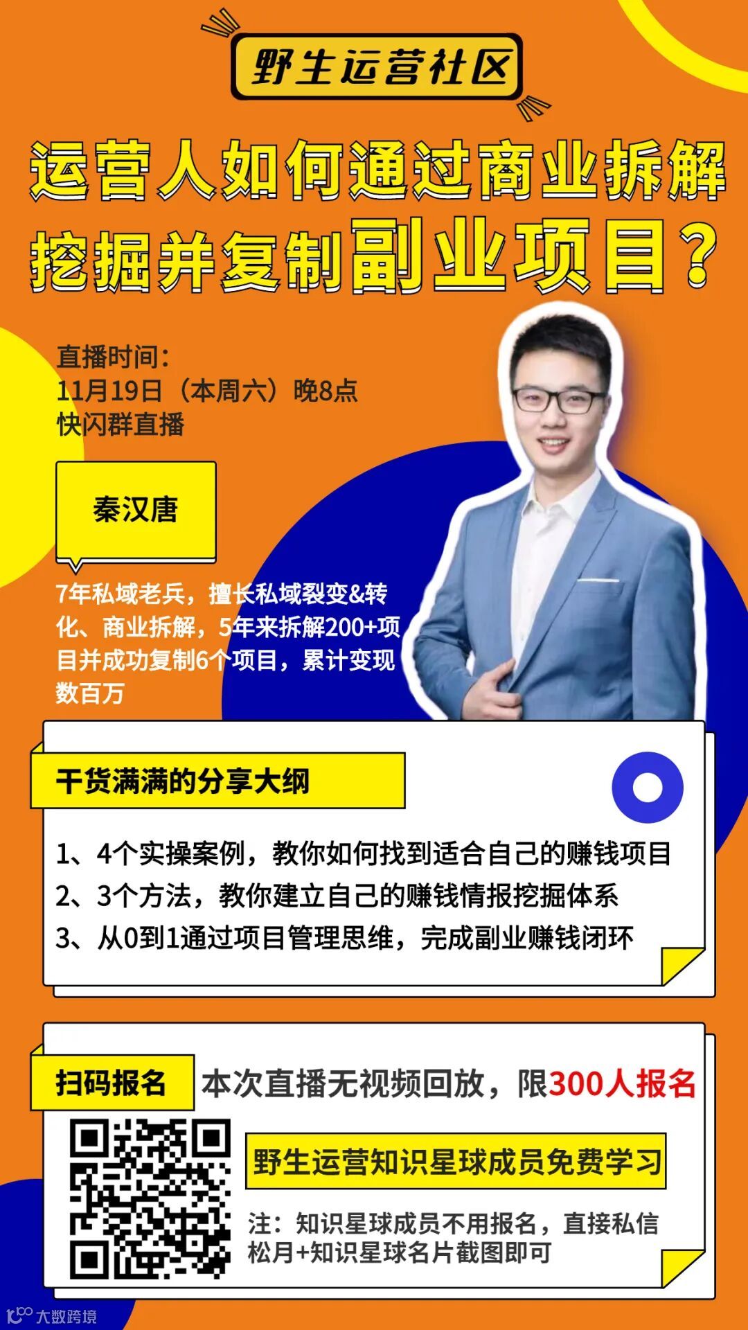 今晚8点,我邀请了“5年来拆解200+项目并成功复制6个项目,累计变现数百万”的私域老兵秦汉唐,带来分享《运营人如何通过商业拆解,挖掘并复制适合自己的副业项目》~