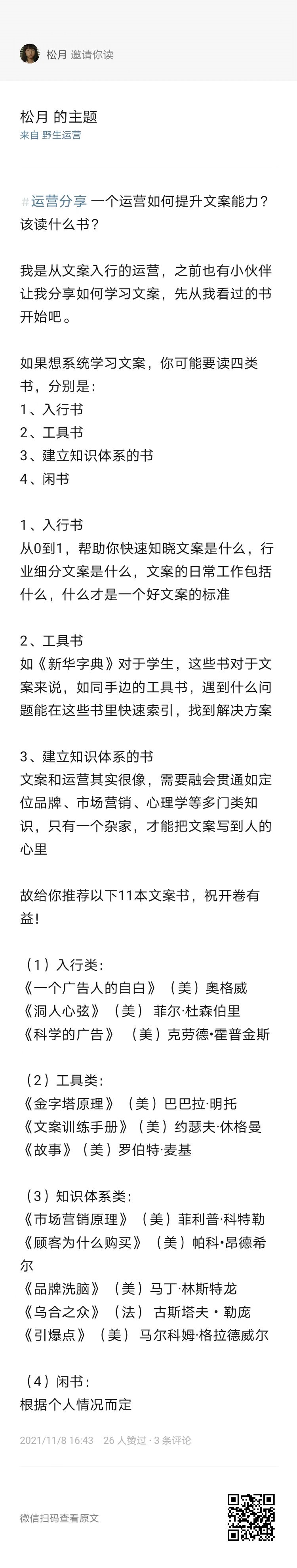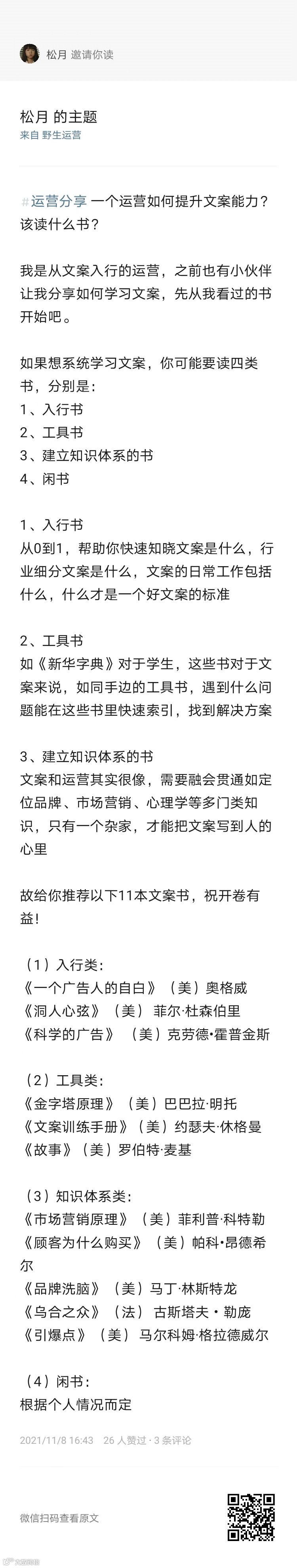 提升文案能力,我觉得,需要阅读 4 类书籍,才能让你的文案不仅有传播力、有美感、还能有实际的价值产出(扫码二维码,加入“野生运营知识星球”,查看更多运营人提升方法)