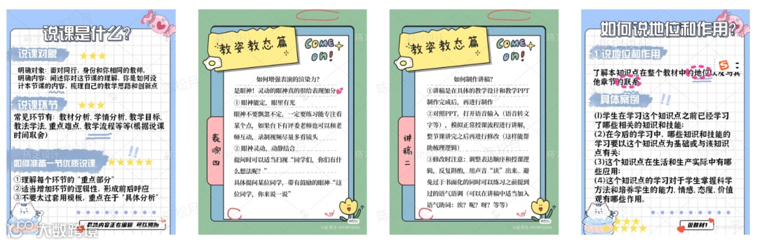 在开始时要描述清楚整体的模块划分和对应的更新顺序——“教资教态共分为四个模块,今天分享的是第一个模块:声音”;在结束时可以进行首尾呼应,并且预告下一篇笔记内容,让用户产生“期待心理”。