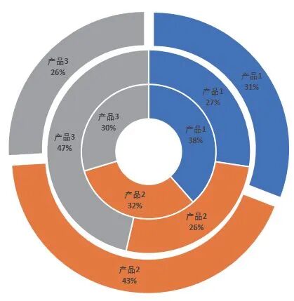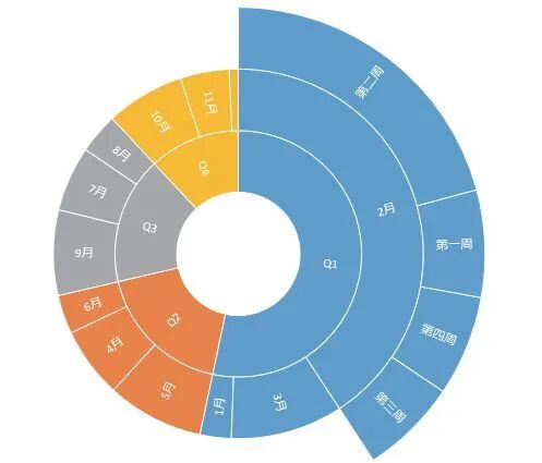 树状图在显示超过两个层级的数据时,基本没有太大的优势。这时就可以使用旭日图。旭日图主要用于展示数据之间的层级和占比关系,从环形内向外,层级逐渐细分,如下图所示。它的好处就是想分多少层都可以。其实,旭日图的功能有些像旧版Excel 中制作的复合环形图,即将几个环形图套在一起,只是旭日图简化了制作过程。