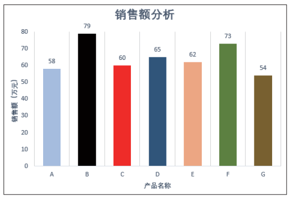 通常来说,柱形图用于显示一段时间内数据的变化,即柱形图的X轴是时间维的,用户习惯性认为存在时间趋势(但表现趋势并不是柱形图的重点)。遇到X轴不是时间维的情况,如需要用柱形图来描述各项之间的比较情况,建议用颜色区分每根柱子,改变用户对时间趋势的关注。如下图所示为7个不同类别数据的展示。
