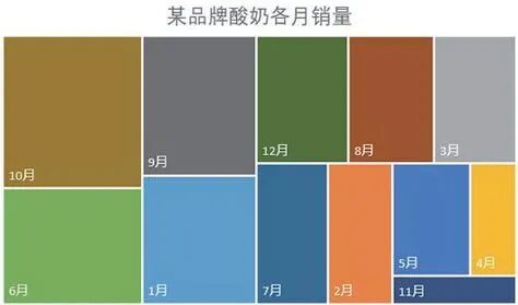 树状图全称为矩形式树状结构图,可以实现层次结构可视化的图表结构,以便用户轻松地发现不同系列之间、不同数据之间的大小关系。如下图所示的图表中,可以清晰看到该酸奶在10 月份的销量最高,其他月份的销量按照方块的大小排列。