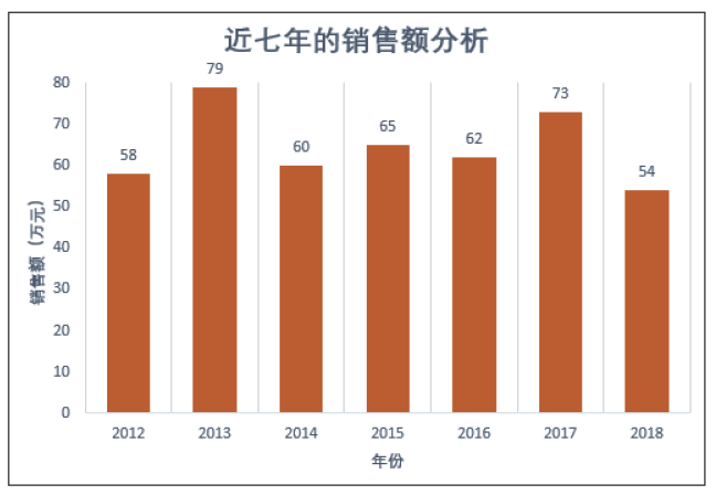 柱形图是最常见的图表类型,它的适用场合是二维数据集(每个数据点包括两个值,即X和Y),但只有一个维度需要比较的情况。例如,如下图所示的柱形图就表示了一组二维数据,【年份】和【销售额】就是它的两个维度,但只需要比较【销售额】这一个维度。
