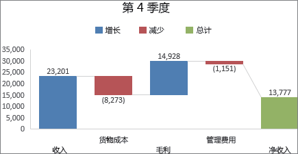 瀑布图采用绝对值与相对值结合的方式,适用于表达数个特定数值之间的数量变化关系,如下图所示。