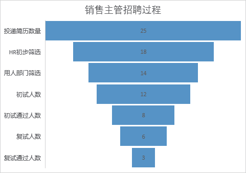 漏斗图通常用于表示销售过程的各个阶段,如下图所示为使用漏斗图对销售主管招聘过程的人数进行展示。