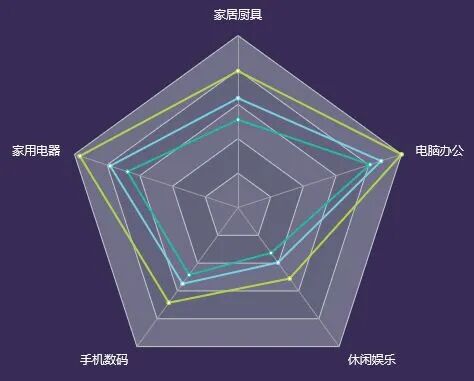 雷达图中,面积越大的数据点,就表示越重要。雷达图适用于多维数据(四维以上),且每个维度必须可以排序。但是,它有一个局限,就是数据点最多6 个,否则无法辨别,因此适用场合有限。而且很多用户不熟悉雷达图,阅读有困难。使用时应尽量加上说明,减轻阅读负担。