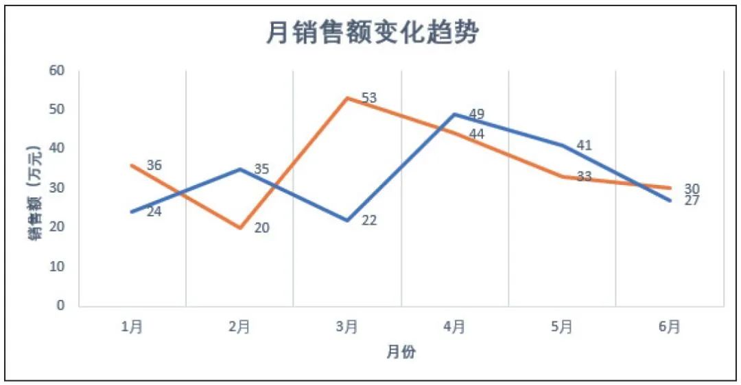 折线图也适合多个二维数据集的比较,如下图所示为两个产品在同一时间内的销售情况比较。