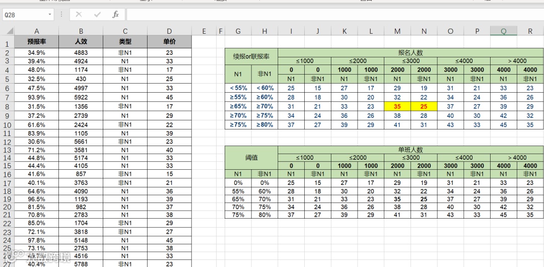 如下图所示,根据报名人数的范围与类型从右边的单价表中查找对应的单价。
