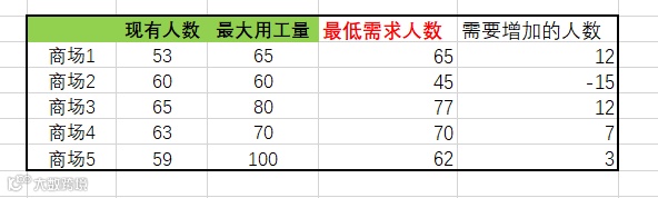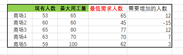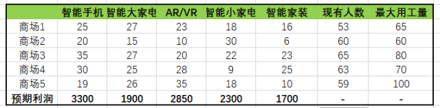 在以上的题目中要保持总的预期利润最大化的情况下如何实现人员的优化配置,从上面的结果中我们可以看出各个商场的最小的需求人数,建立如下的表格: