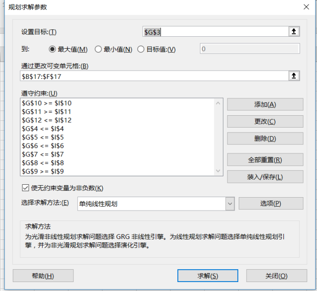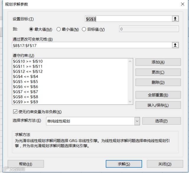 然后执行以下规划求解的操作:不知道规划求解怎么打开的请参阅往期文章:最佳数字组合问题(规划求解)?这个东西你肯定用得着!