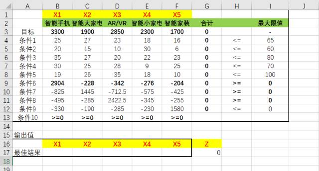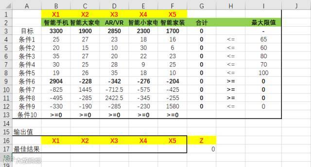 根据以上条件的约束,我们在excel中建立如下的表格条件数据: