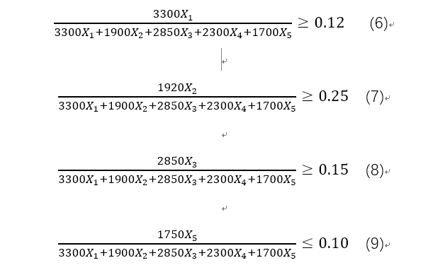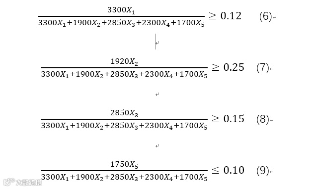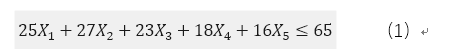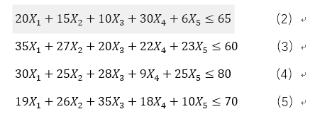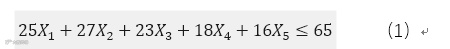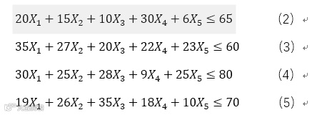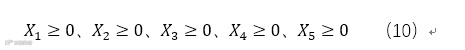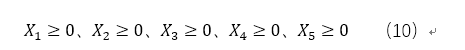 同时,X1 , X2, X3, X4, X5应该为非负数,得到约束条件为: