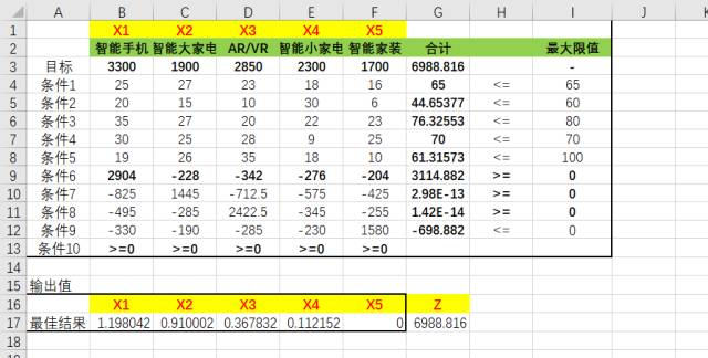 在以上的例子中,每个商场都有都大的人数限制,并且智能手机、智能大家电、AR/VR和智能家装都有销售比例的限制。