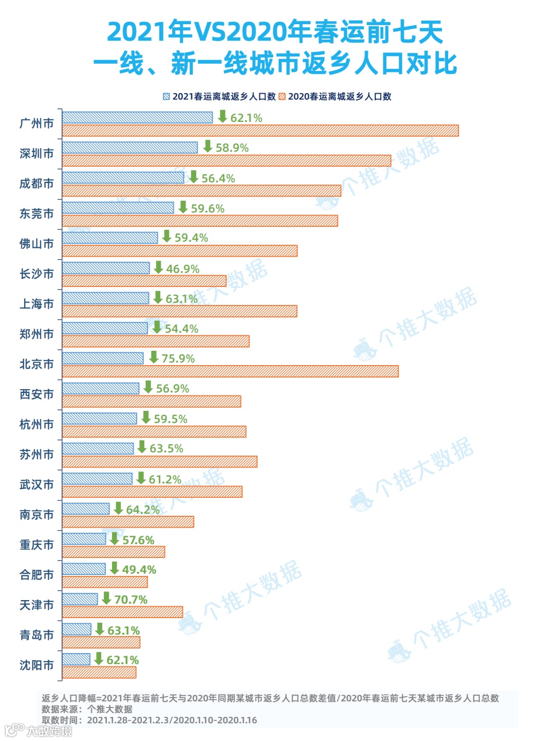 其中,2021年春运前七天,19个一线、新一线城市返乡人口数量都较去年同期有较大幅度的减少,最高降幅超七成,最低降幅也近五成。