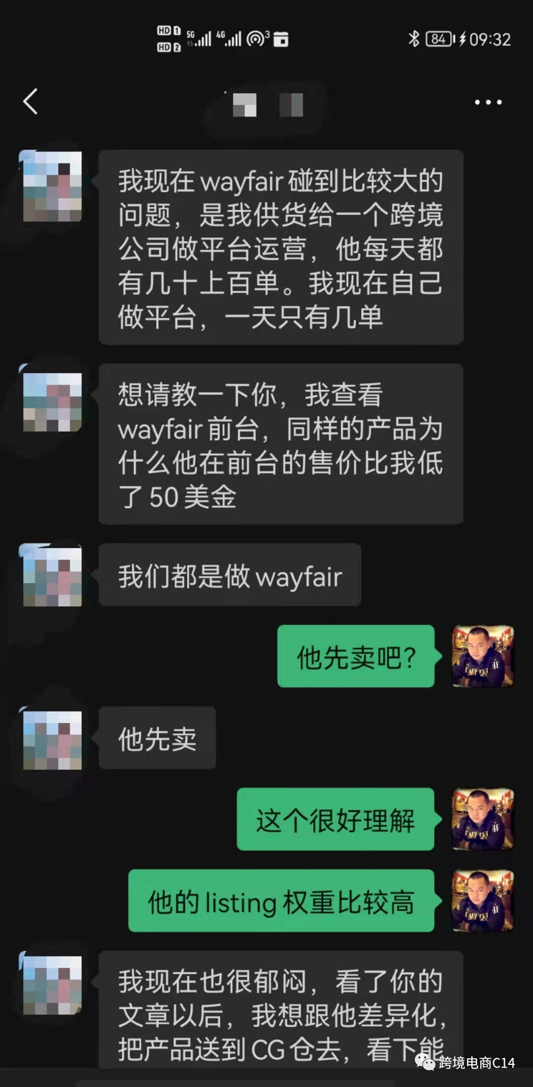 👆这个卖家本身自己是工厂,供货给另外一个wayfair卖家。然后看跟自己拿货的客户wayfair卖的不错,一天有几十单(大件,高客单价),自己也在wayfair卖同样的产品。(这个行为其实无可厚非,很多工厂看到自己客户亚马逊或者wayfair卖的好都会自己也开个账户卖)。但是自己作为工厂反而卖的很少,一天只有几单。而且一样的产品,对方的前台零售价比他要低50美金,批发价的话,工厂不会高于跟自己拿货的客户。