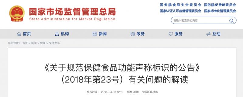 2018年2月13日,原食品药品监管总局发布了《关于规范保健食品功能声称标识的公告》(2018年第23号),明确了保健食品功能声称标识的有关事项。