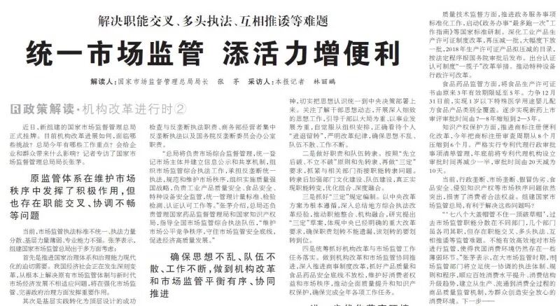 其次是基层实践转化为顶层设计的成功探索。近年来,全国七成县区、1/4左右的地市实行了综合执法,较好解决了市场监管体制不顺畅、机构设置和职责划分不科学、职能转变不到位等问题。这次机构改革充分吸收基层经验,整合优化市场监管重要领域监管职能,完善了国家层面制度设计。