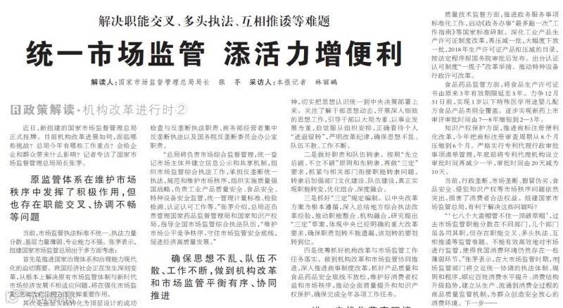 “‘七八个大盖帽管不住一顶破草帽’,过去市场监管职能分散在不同部门,几个部门虽各司其职,但存在职能交叉、多头执法、互相推诿等监管难题。不能有效高效地对市场进行监管,使得我国消费环境仍然存在一些薄弱环节。”张茅表示,在大市场监管时期,市场监管部门将立足统一协调的执法体制、规则和程序,顺应百姓消费水平提升、消费结构升级趋势,建立从生产、流通到消费全过程的商品质量监管机制,为群众创造安全放心的消费环境。下一步——