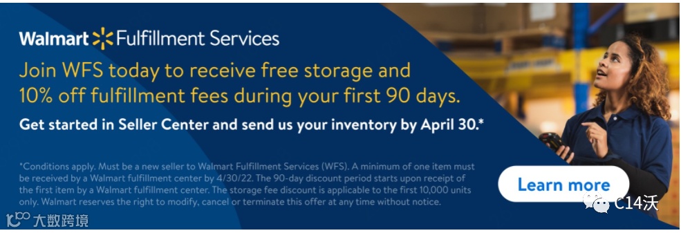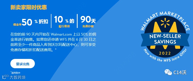 这个是沃尔玛的限时WFS优惠活动,现在加入 WFS,可享受三个月(90天)的仓储免费以及九折的配送费优惠。