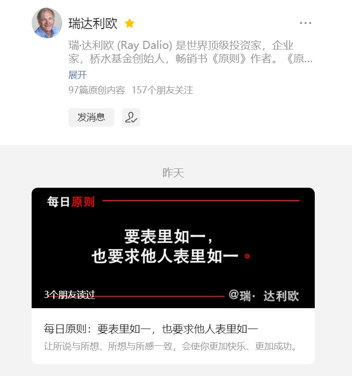 自从去年看了《原则》一书,并且顺便关注了瑞达利欧在中国的官方公众号,强烈推荐你关注下,能给人带来非常正面的的心理能量和情绪价值,始终有一句话在我平时遇到问题时鼓舞着我“绝对不容忍问题,要直面它”。