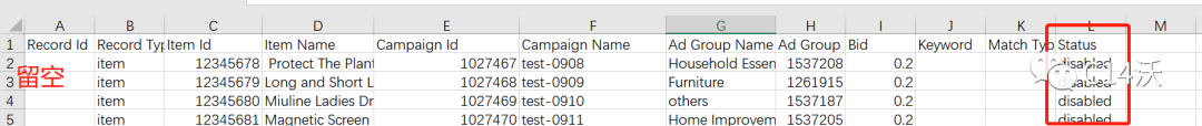 :项目Id,活动名称,活动Id,广告组名称,广告组Id,状态。对于自动活动,也要完成Bid字段。
