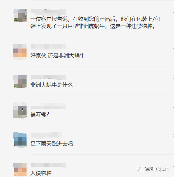 如上图所示,有一位商家朋友在群里吐槽说,有客户反馈在收到货物的包装上发现了一只巨型非洲虎蜗牛。如果只是普通的蜗牛,这件事应该只是大家茶余饭后的谈资,这只蜗牛居然还是违禁物种。很多朋友都会觉得这是“大自然的馈赠”,与商家无关,因为大家都是在中国,这种事肯定不会被小题大作的,但是事发地在美国,一切就都不一样了。