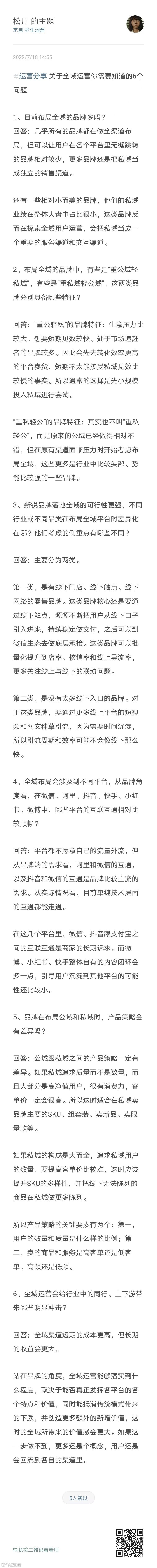 核心一句话,概括何谓全域增长:建立多平台引流到私域承接的多链路流量体系,实现广泛引流+有效承接+精准转化的运营链路。前两天,我在知识星球上也分享了,“做全域运营,你需要提前了解的6个问题”👇