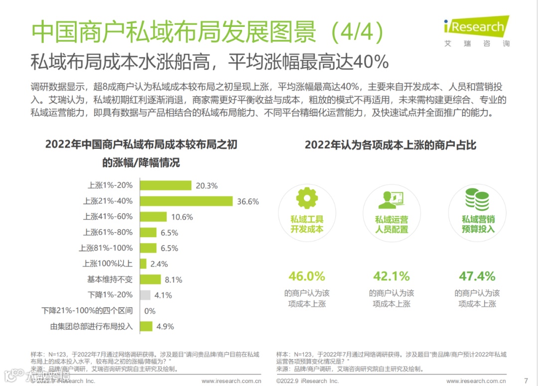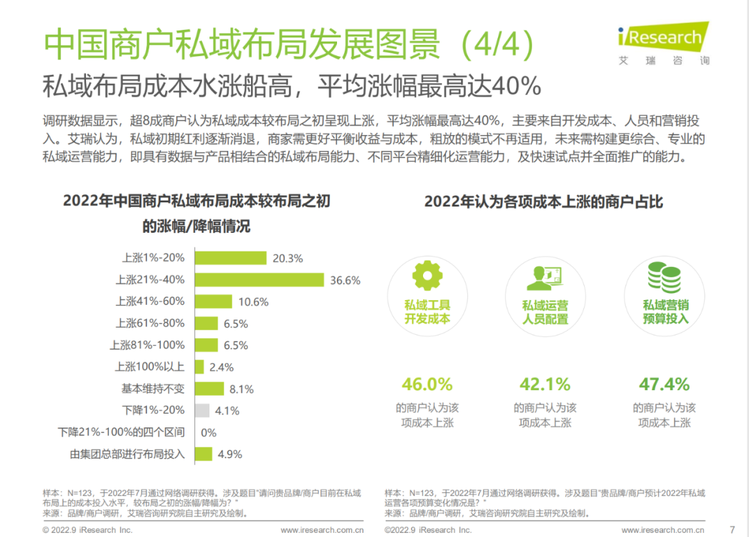最近艾瑞咨询发布了《2022中国商户私域布局洞察报告》,“私域布局成本平均涨幅最高达 40% ”,里面很多事实,和大家很多体感相同:私域拉新越来越难且贵、用户对私域越来越有免疫力且挑剔、私域无法和电商平台数据打通运营无抓手……