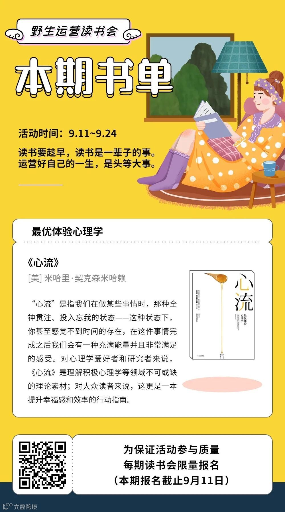 下期读书会,9月11日~24日,正好是中秋三天小长假,我们会开启新一轮共读《心流》,这是一本能让你获得长期内心宁静的书,内卷环境下,inner peace 真的很重要,不仅关乎你职场的幸福感,更关乎你整个人生的幸福感。
