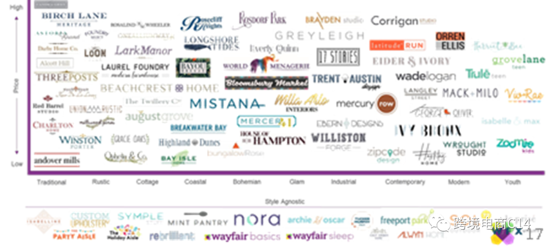 这些自有品牌都分别对于不同类目,不同风格,不同价位。买家在wayfair平台购买的绝大部分产品(超过95%)都是这90+的wayfair自有品牌。