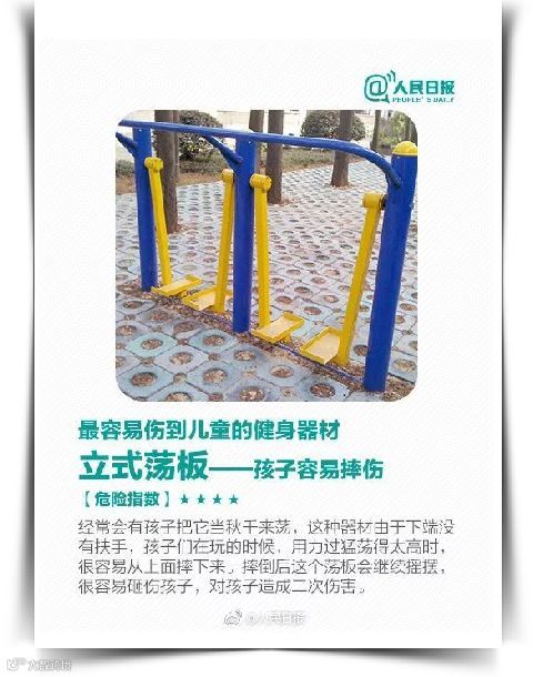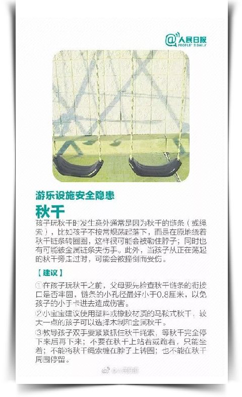 这种秋千链条衔接口不牢固会很危险,孩子未抓牢易被甩出去。当有人荡秋千时,孩子站在前后会被撞倒。