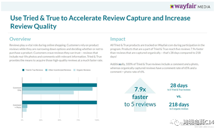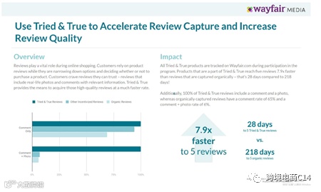 Tried and True 是Wayfair平台官方设置的送测活动,类似亚马逊的VINE,建议新上架的产品,在明确自己产品品质没问题的前提下,都可以试试。卖家参加以后把产品免费送给消费者,换取优质真实评论,积累产品的早期数据,也获得关于产品本身的宝贵反馈信息用于品控和改良。这里不能控制好评数量,但是完全真实,只要产品不出大问题,对于数据的提升作用是很好的