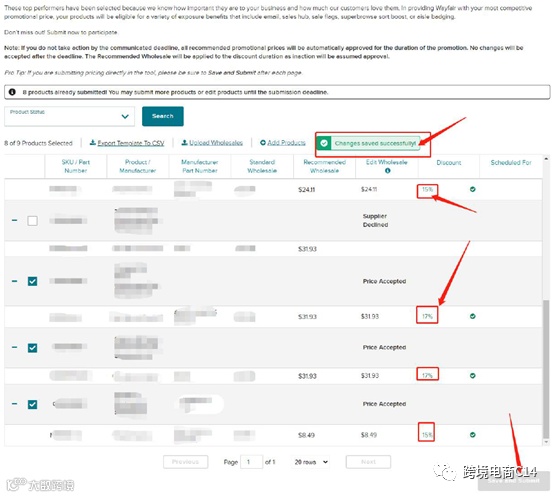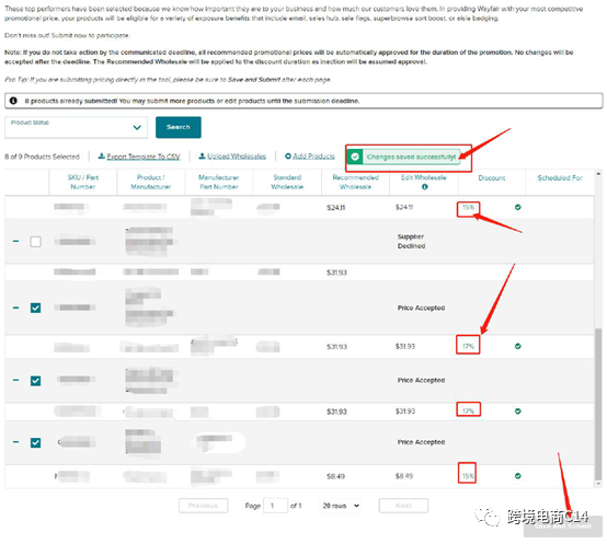 3. 勾选想要参加活动的产品,后面会出现平台给的产品折扣,跟零售价的设置一样,这里的折扣是平台系统根据产品的销售情况等后台数据计算出来的,不会全部一样,折扣越高,自然难销量的增加就越高。即使有的折扣太高计算下来利润被挤压,也可以适当设置一定产品数量进入活动,当做是前期提升销量的一种手段。全部填加完毕之后提交就可以了
