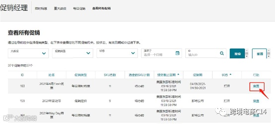 2. 进入界面后,可以看到我们已经参加的各项促销活动,每项有自己的ID、名称、选择过的sku数量等。要参加下个月的促销活动,一般要提前一两个月提交报名人工审核,因此要关注促销活动,早点报名。这里我们选择第一项活动,点击Review