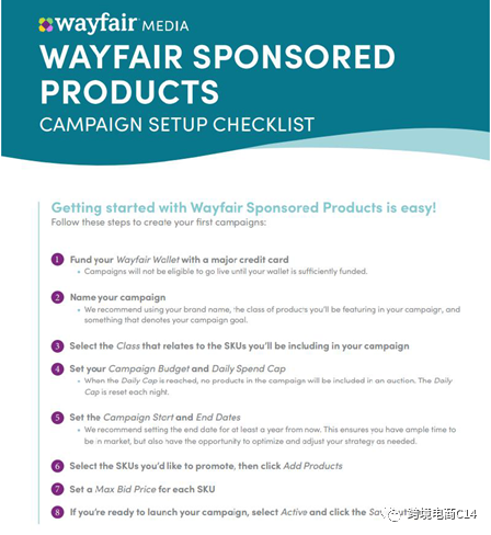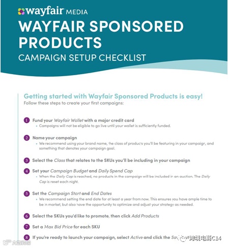 “跨境电商C14”应该是全行业拥有最全面、最系统化、最新的关于wayfair平台的干货、资讯的公众号,如果你在做或者打算做wayfair平台,请点击上方公众号关注、标星!