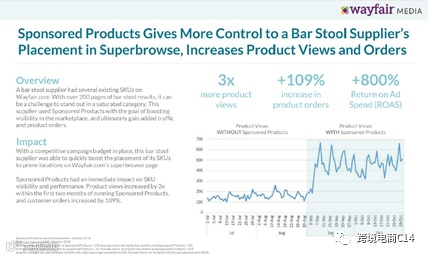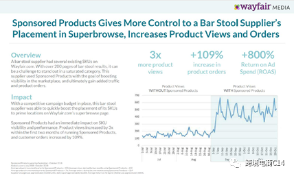 以下是Wayfair平台给自己的广告打的一个广告,也就是官方宣传自己的广告服务,毕竟除了赚差价,广告也是平台的一个利润中心。这个宣传里面提到,一个有200页搜索结果的酒吧凳,打了广告以后点击量提升为以前的3倍,订单量翻番,ROAS为800%即投入1元收回8元。实际操作中,卖家大可以拿自己的产品试验一下实际效果,根据自己的ROAS和理念战略决定要不要把持续的广告投入作为一个长期运营策略