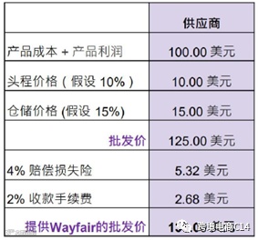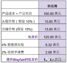 采购价+头程+仓储费+操作费+Wayfair 4%货损费用+2%(30天结款费)+预估退货成本(退货大部分只能销毁,无法再次销售) +利润;如图: