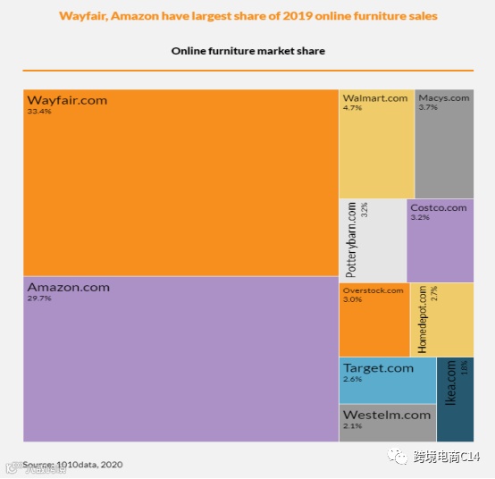 一:wayfair目前是欧美家居类目电商平台排名第一,家居类目的市场份额超过亚马逊的。如图: