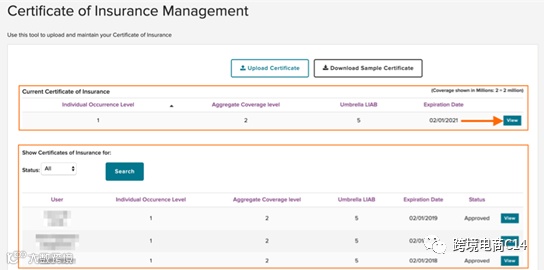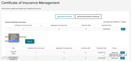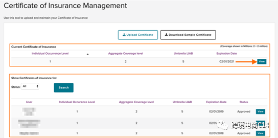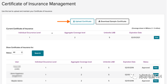 第三步:在current certificate of insurance(当前保险证明)一栏中查看所有当前证明。下方会显示所有的证明文件。可以在Status(状态)下拉菜单中筛选不同状态的证明。如果要下载或查看任何一份保险证明,点击View(查看)