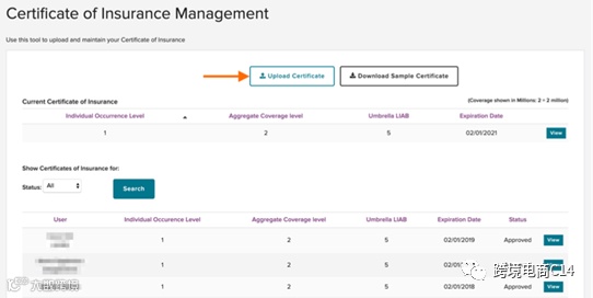 第四步:点击UploadNew Certificate of Insurance(上传新保险证明)来上传新凭证