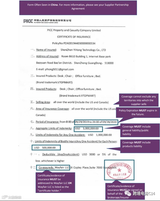 Wayfair平台要求卖家每年提供一份保险证明。请参考以下要求和范例,确保您的保险凭证符合我们的标准。